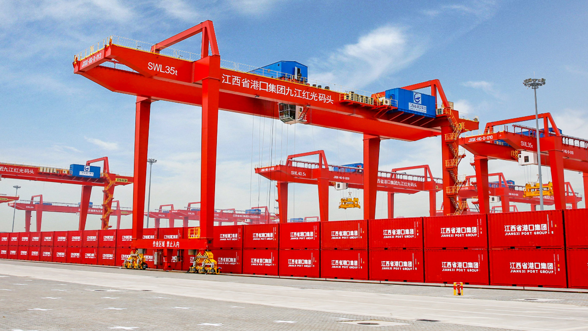 轨道式集装箱门式起重机(简称场桥)适用于港口、码头、铁路、物流等集装箱堆场或中转站的国际标准集装箱及铁路宽箱的搬运及装卸。通过多组钢轮支撑在轨道上,以市电为动力,由大车机构、小车总成、龙门架、动力系统、集装箱专用吊具等组成。