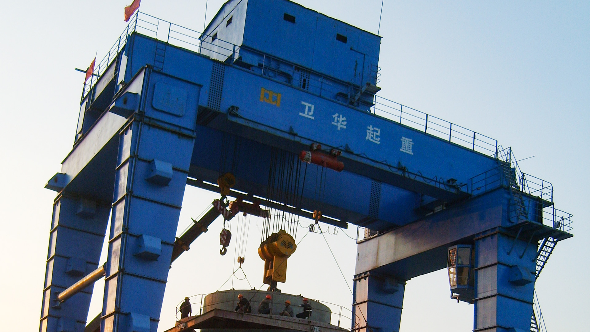 自顶升门式起重机和U型门式起重机类似,门架结构为U型门机,区别在于支腿不同。由于特殊工作场合,大型起吊设备无法进场,自顶升门机支腿制作成几段,每段支腿上都有千斤顶顶升支座。小车、主梁端梁组装好后,采用千斤顶顶起,依次将每段支腿用法兰连接到一起。之后安装下横梁、大车运行机构。